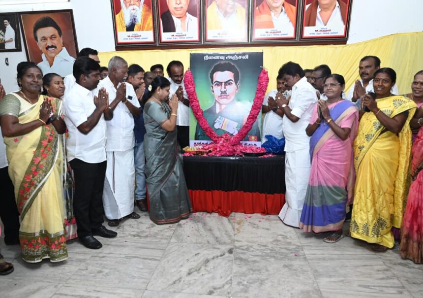 தூத்துக்குடி இம்மானுவேல் சேகரனின் 68வது ஆண்டு நினைவு நாளை முன்னிட்டு வடக்கு மாவட்ட திமுக சார்பில் எட்டையாபுரம் சாலையில் உள்ள கலைஞர் அரங்கில் அலங்காிக்கப்பட்ட அவரது படத்திற்கு வடக்குமாவட்ட திமுக செயலாளரும் சமூகநலன் மற்றும் மகளிர் உாிமைத்துறை அமைச்சர் கீதாஜீவன் மலா் தூவி மாியாதை செய்து வணங்கினாா்.