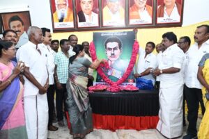 நிகழ்ச்சியில் மாநகர செயலாளர் ஆனந்தசேகரன், துணைச்செயலாளர் பிரமிளா, ஓன்றிய செயலாளர் காசிவிஸ்வநாதன், பொதுக்குழு உறுப்பினர் கஸ்தூரி தங்கம், மண்டலத்தலைவர் வக்கீல் பாலகுருசுவாமி, மாநில பேச்சாளர் சரத்பாலா, மாநில பொறியாளர் அணி துைண செயலாளர் அன்பழகன், மாவட்ட அணி தலைவர்கள் அருண்குமாா், பழனி, மகளிர் அணி அமைப்பாளர் கவிதாதேவி, மாவட்ட தகவல் தொழில்நுட்ப அணி அமைப்பாளர் அபிராமிநாதன், துணை அமைப்பாளர்கள் அந்தோணி கண்ணன், அருணாதேவி, நாகராஜன், மாவட்ட இளைஞர் அணி துணை அமைப்பாளர் ராதாகிருஷ்ணன், பகுதி செயலாளர் ஜெயக்குமாா், மாவட்ட பிரதிநிதிகள் நாராயணன், செல்வக்குமாா், மாநகர இலக்கிய அணி அமைப்பாளர் ஜீவன்ஜேக்கப், மாநகர இளைஞர் அணி அமைப்பாளர் அருண்சுந்தர், அயலக அணி அமைப்பாளர் கிறிஸ்டோபா் விஜயராஜ், அணி துணை அமைப்பாளர்கள் ரவி, குமரன், நாராயணவடிவு, மகேஸ்வரன்சிங், கவுன்சிலர்கள் நாகேஸ்வரி, ஜெயசீலி, சரவணக்குமார், ஜான்சிராணி, வைேதகி, வட்டச்செயலாளர்கள் கதிரேசன், பாலகுருசாமி, வட்டப்பிரதிநிதிகள் மூக்கையா, பாஸ்கா், மற்றும் மணி, அல்பட், உள்பட பலர் கலந்து கொண்டு மலா்தூவி மாியாதை செய்தனா்.