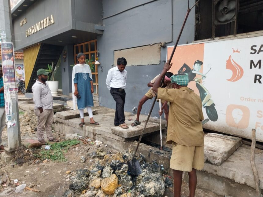 மேலும் கழிவு நீர் கான்களில் நீ திரும்பி செல்லும் நிலையில் இருந்தது இதனால் அப்பகுதியில் மாலை நேரம் அப்படியே இருந்தது. மாநகராட்சி மேயர் ஜெகன் பெரியசாமி, ஆணையர் ப்ரியங்கா ஆகியோர் மாநகராட்சி அதிகாரிகளுடன் மூன்றாம் மைல் பகுதியில் ஏன் மழை நீர் செல்லாமல் தேங்கி உள்ளது என்று தொடர்ந்து பார்வையிட்டு வந்ததில் பாலிடெக்னிக் எதிர்புறம் உள்ள பிரபல ஹோட்டல் இறைச்சி கழிவுகள் மேலும் செப்டிக் டேங்க் அமைக்காமல் நேரடியாக கழிவுநீர் கானில் விடப்பட்டது தெரியவந்தது. அதன் மூலம் சுமார் 30 அடி நீளத்துக்கு கழிவு நீர் கான் அடைப்பு ஏற்பட்டுள்ளது இதனை பார்வையிட்ட மாநகராட்சி மேயர் ஜெகன் பெரியசாமி, ஆணையர் ப்ரியங்கா ஆகியோர் உத்தரவின் பெயரில் நகர் நலஅலுவலர் டாக்டர் சரோஜா ஆலோசனையின்படி, மேற்கு மண்டல சுகாதார அலுவலர் ராஜபாண்டி தலைமையில் சுகாதார ஆய்வாளர் பணியாளர்கள் கழிவுநீர் கான் மீது போடப்பட்டுள்ள சிமெண்ட் பிளேட்டை அகற்றி பார்த்த போது மனித கழிவுகள் இறைச்சி கழிவுகள் அப்படியே தேங்கி பாறை போல உறைந்திருந்தது. இது சுமார் 30 அடி நீளத்துக்கு இருந்ததால் எந்த ஒரு தண்ணீர் செல்ல முடியாத சூழ்நிலை இருந்துள்ளது. இதனை அடுத்து உடனடியாக 30 அடி நீளத்துக்கு கழிவுநீர் கான் மீது போடப்பட்டுள்ள சிமெண்ட் பிளேட் எடுக்கப்பட்டு கானுக்குள் தேங்கியிருந்த பாறை போல இருந்த கழிவுகளை சுகாதாரப் பணியாளர்கள் மிகவும் சிரமப்பட்டு அகற்றினர். சுமார் ஒரு லாரிக்கு மேல் கழிவுகள் அப்புறப்படுத்தப்பட்டது. உடனடியாக தனியார் ஹோட்டல் நிறுவனத்திற்கு 25000 ரூபாய் அபதாரம் விதிக்கப்பட்டது. தொடர்ந்து இதுபோல செயல்களில் ஈடுபட்டால் ஹோட்டலுக்கு சீல் வைக்கப்படும் என்று சுகாதார அதிகாரிகள் எச்சரித்தனர்.