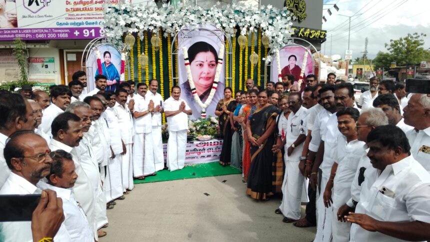 இதனையடுத்து பழைய மாநகராட்சி முன்பு மத்திய வடக்கு பகுதி செயலாளர் ஜெய்கணேஷ் ஏற்பாட்டில் அலங்கரித்து வைக்கப்பட்டிருந்த ஜெயலலிதாவின்; திருவுருவப்படத்திற்கு தேங்காய் உடைத்து மீண்டும் 2026-யில் ஜெயலலிதாவின்; வழியில் அதிமுக ஆட்சி அமைய தீபாராதனை காட்டி பூஜை செய்து வழிபட்டனர். அலங்கரித்து வைக்கப்பட்டிருந்த ஜெயலலிதாவின்; திருவுருவப்படத்திற்கு முன்னாள் அமைச்சர் எஸ்.பி.சண்முகநாதன் மலர் தூவி மரியாதை செலுத்தினார்.