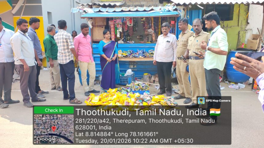 தூத்துக்குடி தமிழக அரசால் தடைசெய்யப்பட்ட பொருட்கள் விற்பனை செய்யக்கூடாது என்று அறிவிக்கப்பட்டிருந்த நிலையில் மாநகராட்சி வடக்கு மண்டலம் திரேஸ்புரம் பகுதியில் மாநகர நல அலுவலர் சரோஜா மற்றும் சுகாதார அலுவலர் ராஜசேகரன் தலைமையில் சுகாதார ஆய்வாளர்கள் கோபிநாத், சரவணக்குமார், ப்ரியங்கா, கரன்சிங்குமார், கண்ணன் ஆகியோர் கொண்ட குழு தமிழ்நாடு அரசால் தடை செய்யப்பட்ட புகையிலை பொருட்கள் பதுக்கி விற்பனை செய்வது அறிந்து ஆய்வு மேற்கொள்ளப்பட்டது.